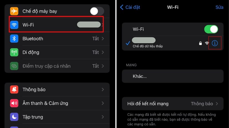 - Bước 1: Người dùng truy cập vào Cài đặt > Chọn mục WiFi > Ấn vào biểu tượng hình chữ “i” bên cạnh tên của WiFi.